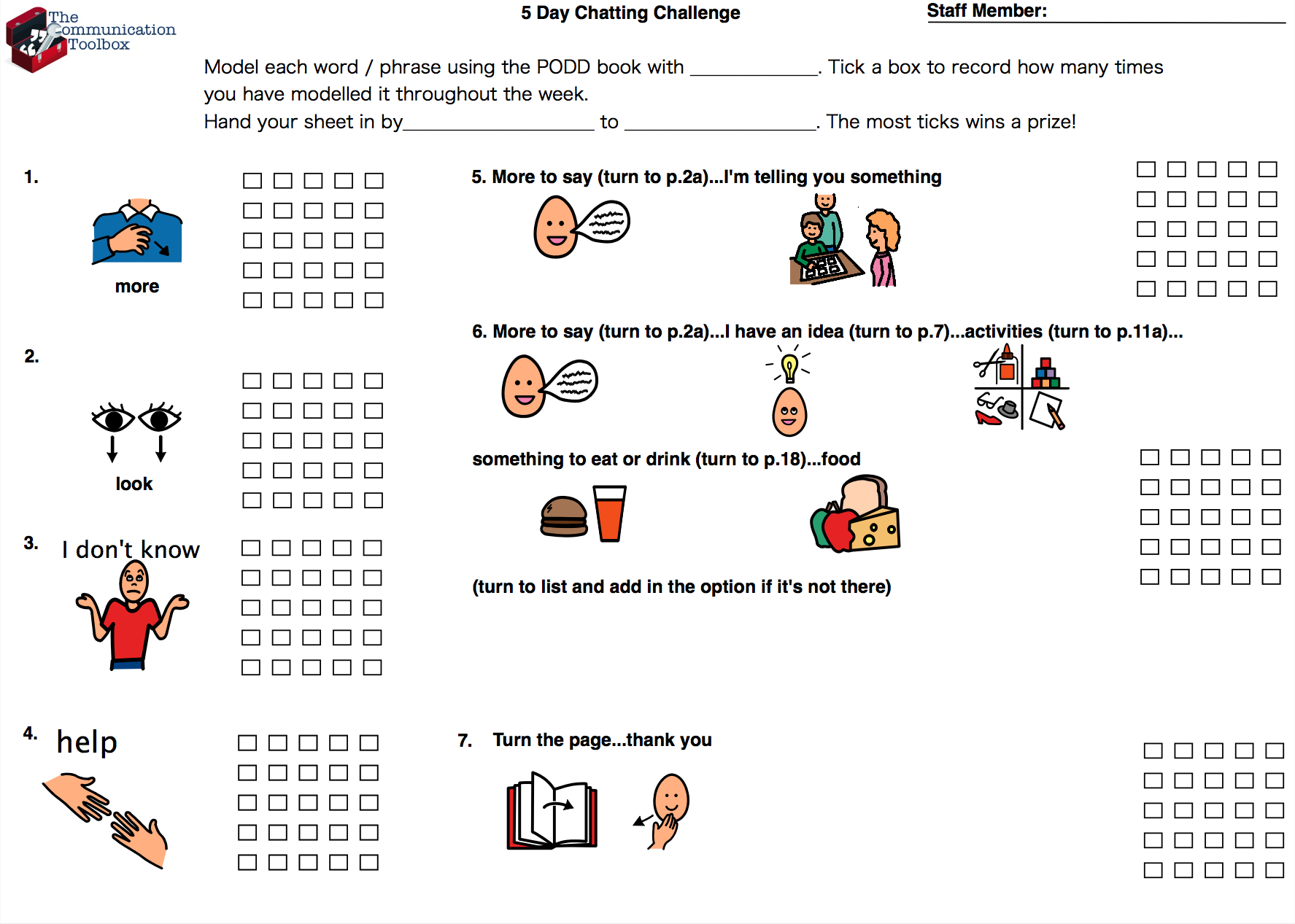 I made this challenge to give to staff supporting a person who uses a PODD book and PODD on a high tech communication system. Staff are learning how to use the light tech PODD and model messages, as well as set up the high tech system and use it throughout the day.